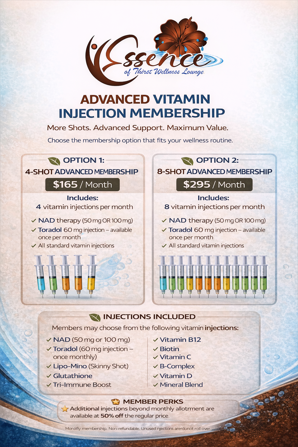 Our Vitamin Injection Memberships are designed to provide ongoing wellness support through routine vitamin therapy. We offer both a Regular Membership and an Advanced Membership, allowing you to choose the option that best fits your wellness goals.